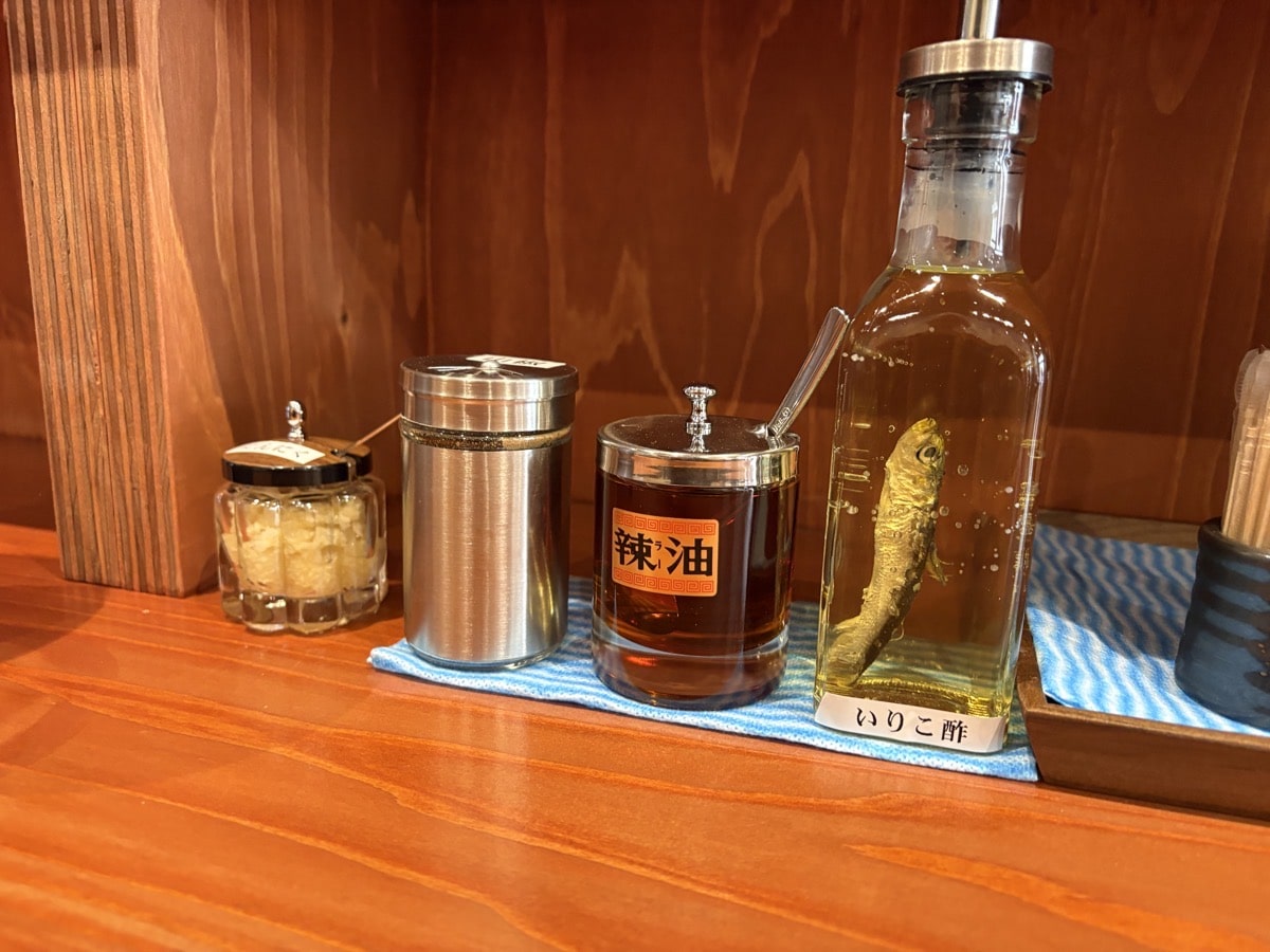 卓上にはにんにく、山椒、辣油、いりこ酢がありました。